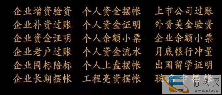 一手资金,全国无限制☞企业验资(免费附赠北京验资报告,做完付款)☞个人摆账、企业摆账,资方名下拉流水,配合客户做财务。。☞上市公司趴帐、走账、美化报表,募集归还☞余额小票、流水对账单,资金证明,出国留学证明☞银行冲量(月末 , 日均)一年阳光存款☞工程亮资,全时热线: 13113691861杨先生